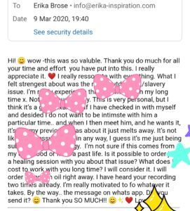 To apply for the healing and counselling program please send an email to erika.inspiration(at)gmail.com and describe briefly where you are currently standing at in your life and where you would like to be. We can also schedule an initial consultation Video Call if you would like to talk to me personally before signing up for this 1:1 program.