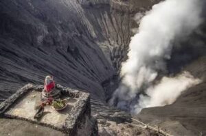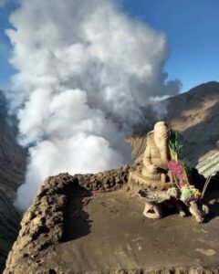 A 700-year-old sacred idol of Lord Ganesh stands atop Mount Bromo, an active volcano in Indonesia’s Bromo Tengger Semeru National Park. Installed centuries ago by the Tengger tribe, the idol is revered as a protective guardian believed to calm volcanic eruptions and safeguard the local community. To this day, devotees continue to offer flowers and fruits in their daily rituals.